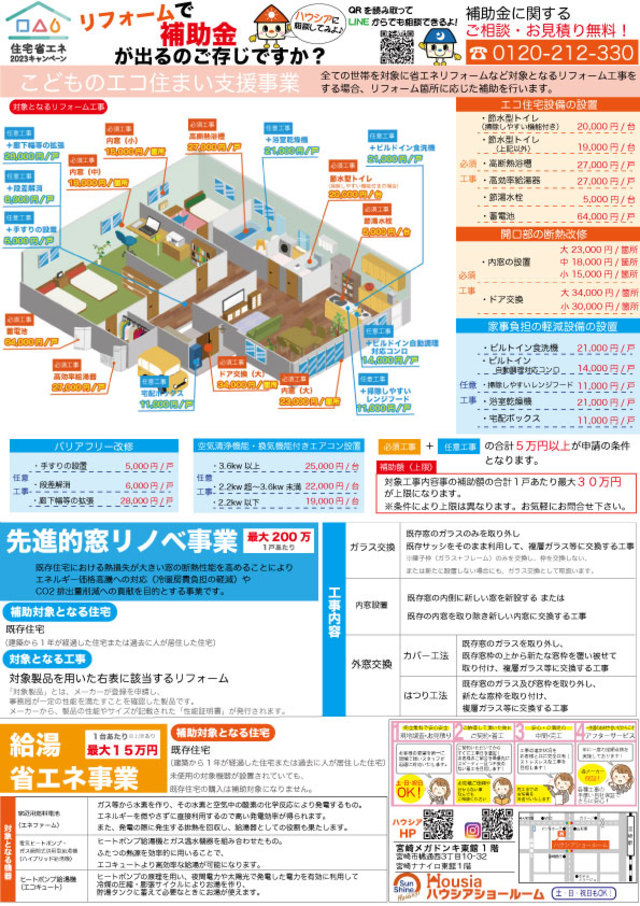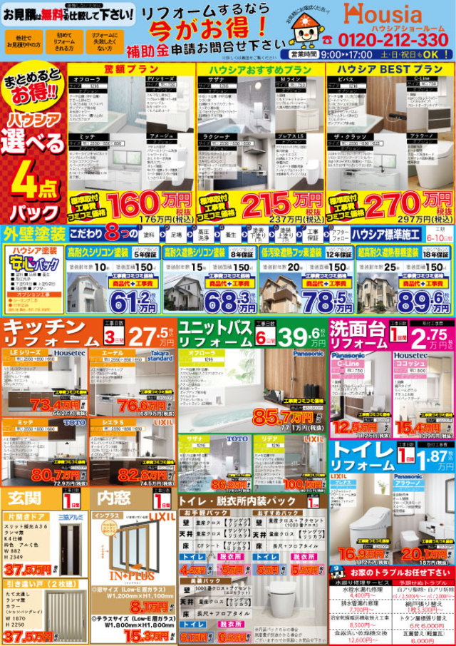 ハウシアでは解りやすい料金設定でコミコミ価格を提示しています。標準工事費、商品代の価格ですので安心なお見積りをご提示させていただきます。ハウシアならではのお得な組み合わせですので是非一度ご覧下さい。些細なことでもお問合せ頂ければ対応させていただきます。ハウシアショールーム〒880-0001 宮崎県宮崎市橘通西3丁目10-32(メガドンキホーテ東館1階)【リフォームでお悩みのそこのアナタ】●どこの業者に頼んでいいか分からない…●適正価格が分からない…●商品イメージが付かない…●様々な緊急時に一括した業者に頼めたら…”宮崎地域密着”の企業だから即解決‼︎“ハウシアショールーム” に全てお任せ下さい‼︎♬安心安全の店舗型運営♬♬最も中心市街地にあり便利♬♬プロのスタッフが常に対応♬♬年中無休でいつでも安心♬