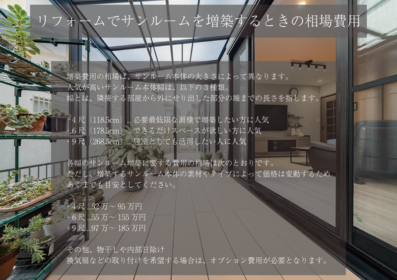 ただし、増築するサンルーム本体の素材やタイプによって価格は変動するため、あくまでも目安としてください。