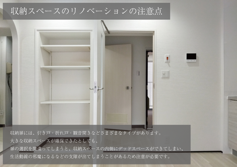 大きな収納スペースが確保できたとしても、扉の選択を間違ってしまうと、収納スペースの内側にデッドスペースができてしまう、生活動線の邪魔になるなどの支障が出てしまうことがあるため注意が必要です。