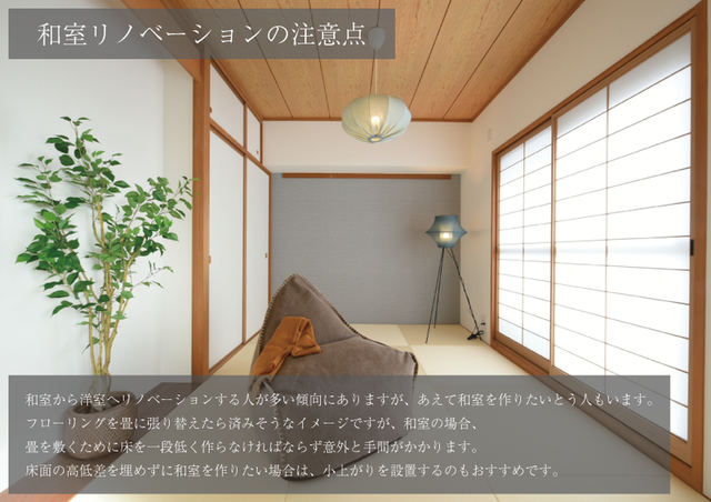フローリングを畳に張り替えたら済みそうなイメージですが、和室の場合、畳を敷くために床を一段低く作らなければならず意外と手間がかかります。