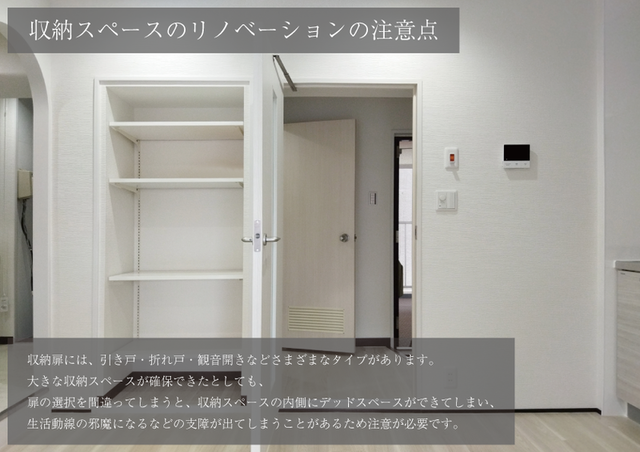 収納扉には、引き戸・折れ戸・観音開きなどさまざまなタイプがあります。