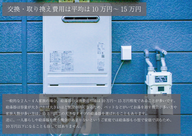 一般的な2人~4人家族の場合、給湯器の交換費用相場は10万円~15万円程度であることが多いです。