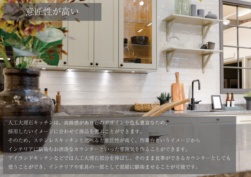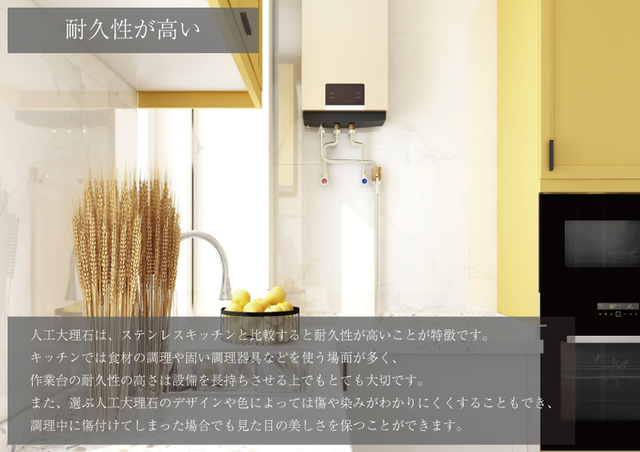 人工大理石は、ステンレスキッチンと比較すると耐久性が高いことが特徴です。