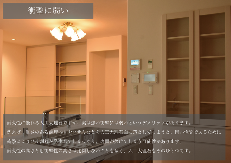耐久性の高さと耐衝撃性の高さは比例しないことも多く、人工大理石もそのひとつです。