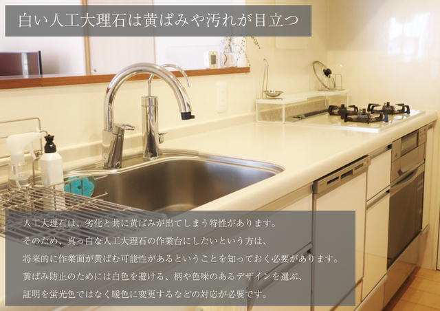 ・白い人工大理石は黄ばみや汚れが目立つ