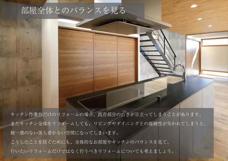 こうしたことを防ぐためにも、全体的なお部屋やキッチンのバランスを見て、行いたいリフォームだけではなく行うべきりフォームについても考えましょう。