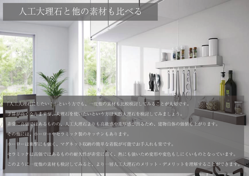 「人工大理石にしたい!」という方でも、一度他の素材も比較検討してみることが大切です。