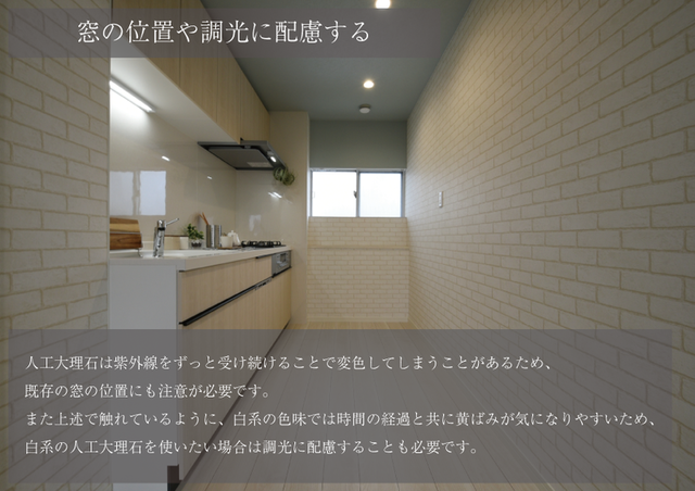 人工大理石は紫外線をずっと受け続けることで変色してしまうことがあるため、既存の窓の位置にも注意が必要です。