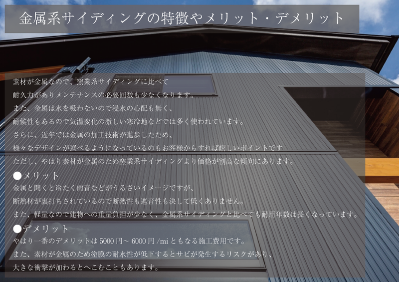 ただし、やはり素材が金属のため窯業系サイディングより価格が割高な傾向にあります。