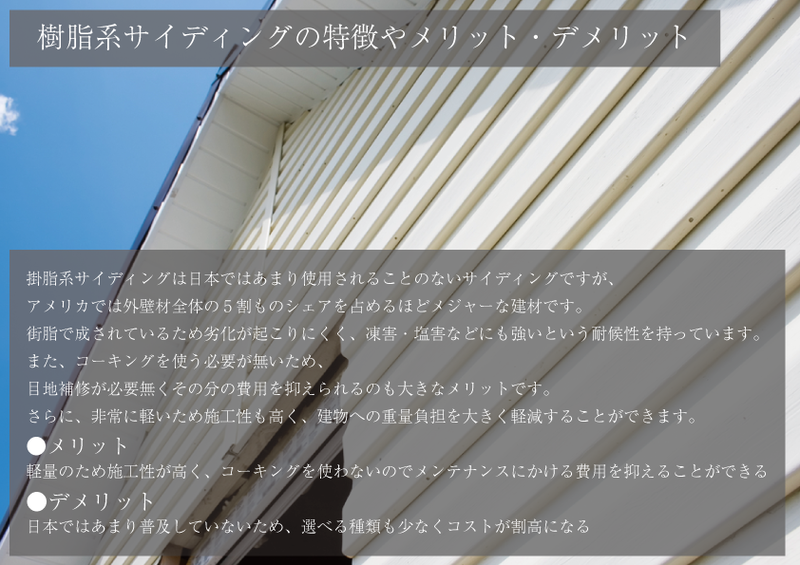 掛脂系サイディングは日本ではあまり使用されることのないサイディングですが、アメリカでは外壁材全体の5割ものシェアを占めるほどメジャーな建材です。
