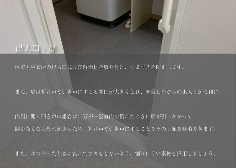 また、扉は折れ戸や引き戸にすると間口が大きくとれ、介護しながらの出入りが便利に。