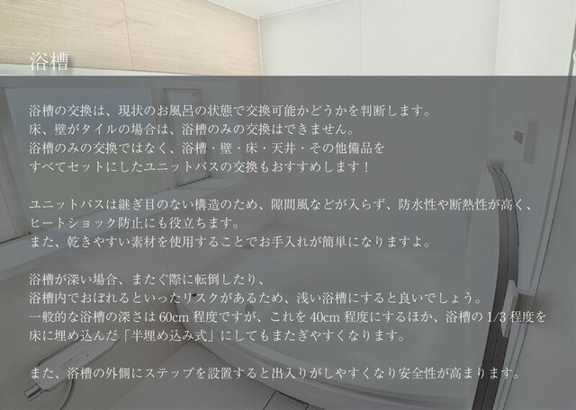 浴槽のみの交換ではなく、浴槽・壁・床・天井・その他備品をすべてセットにしたユニットバスの交換もおすすめします!