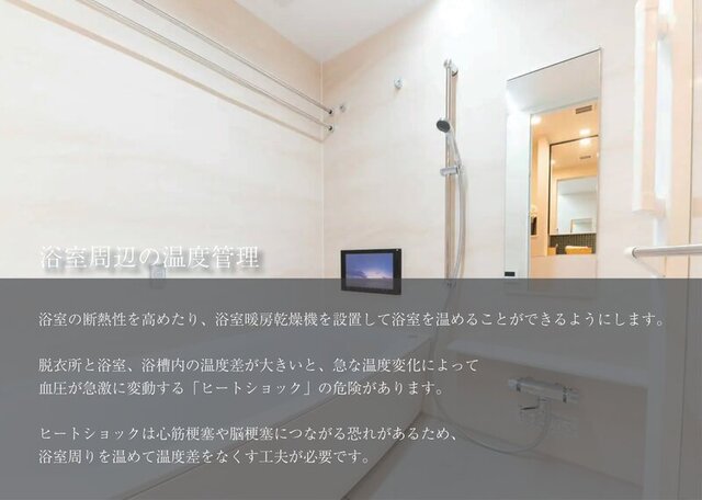脱衣所と浴室、浴槽内の温度差が大きいと、急な温度変化によって血圧が急激に変動する「ヒートショック」の危険があります。
