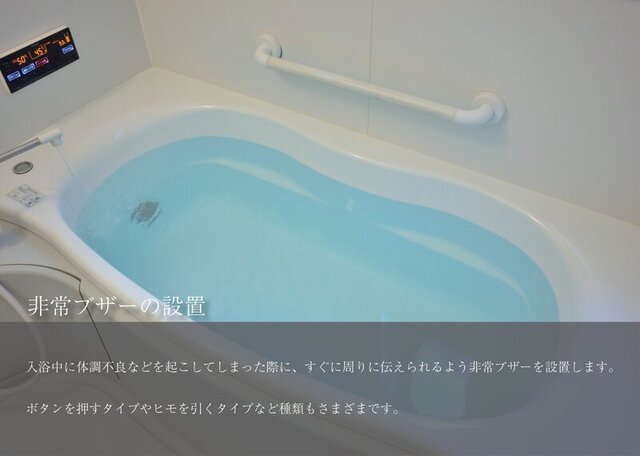 入浴中に体調不良などを起こしてしまった際に、すぐに周りに伝えられるよう非常ブザーを設置します。