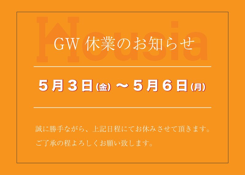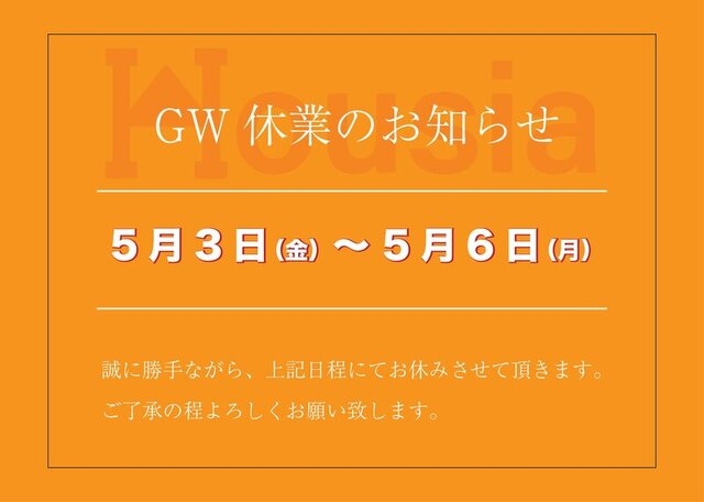GWに伴い、5月3日(金)〜5月6日(月)まで休業とさせていただきます。ご了承の程よろしくお願い致します。※5月7日(火)からの通常営業になります。