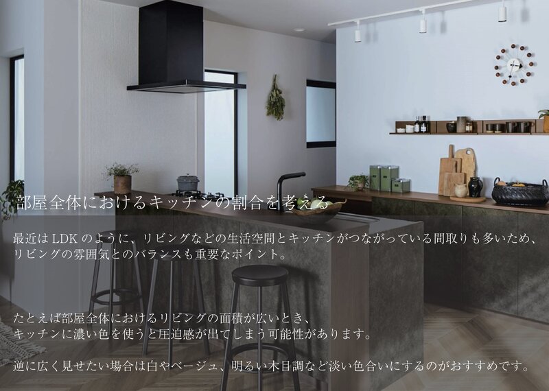 たとえば部屋全体におけるリビングの面積が広いとき、キッチンに濃い色を使うと圧迫感が出てしまう可能性があります。