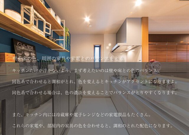 同色系で合わせると調和がとれ、色を変えるとキッチンがアクセントになりますよ。