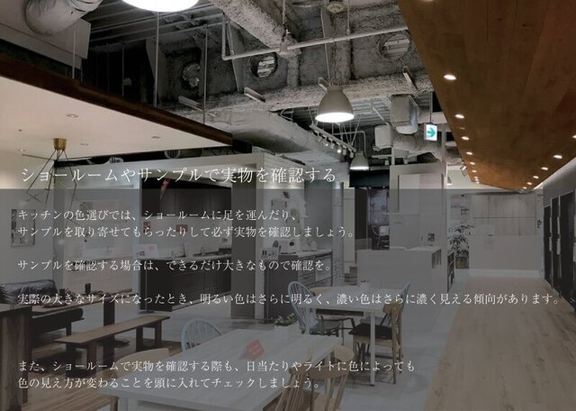 キッチンの色選びでは、ショールームに足を運んだり、サンプルを取り寄せてもらったりして必ず実物を確認しましょう。