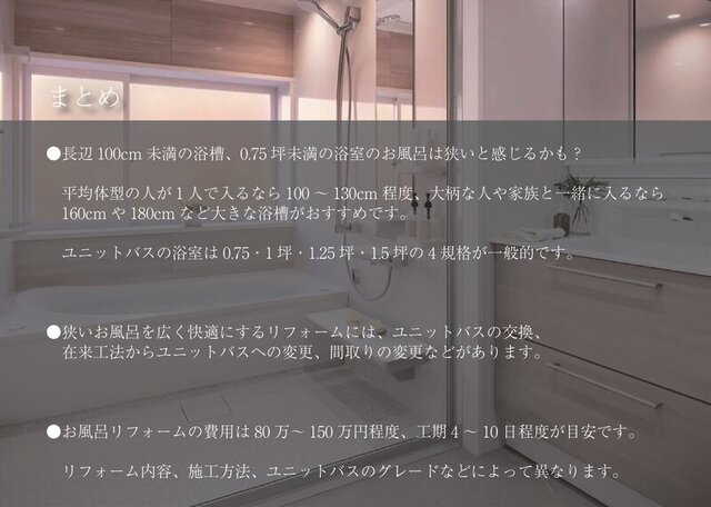 ●長辺100cm未満の浴槽、0.75坪未満の浴室のお風呂は狭いと感じるかも?