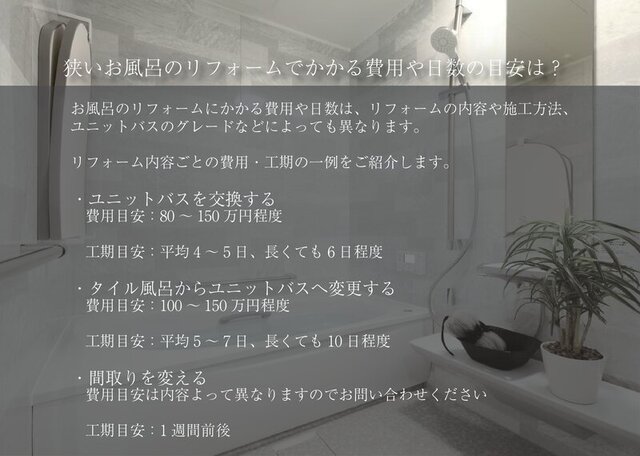 【狭いお風呂のリフォームでかかる費用や日数の目安は?】