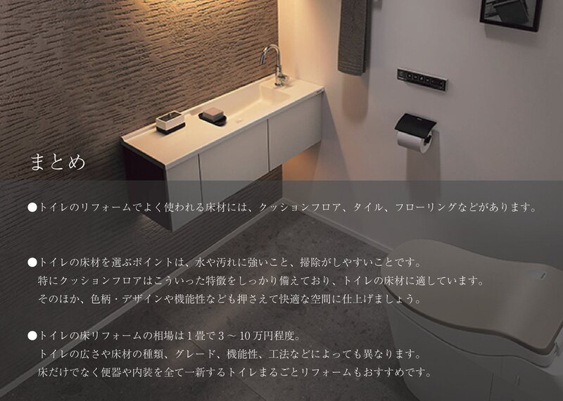 ●トイレの床材を選ぶポイントは、水や汚れに強いこと、掃除がしやすいことです。