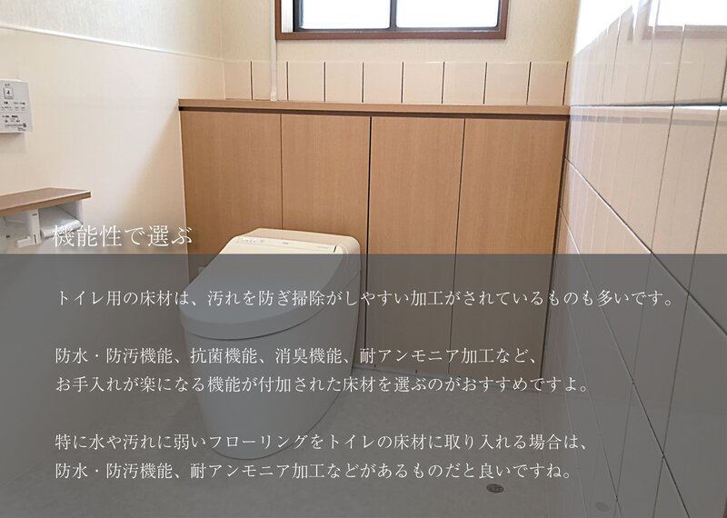 特に水や汚れに弱いフローリングをトイレの床材に取り入れる場合は、防水・防汚機能、耐アンモニア加工などがあるものだと良いですね。