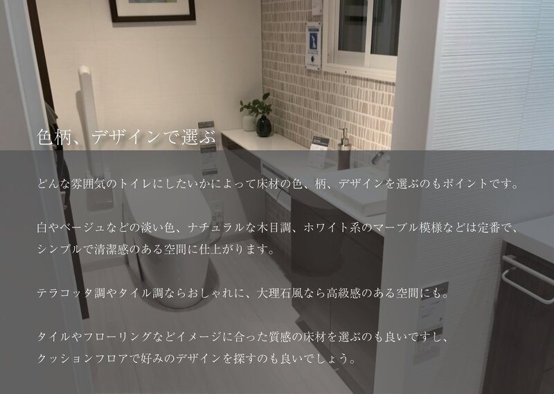 どんな雰囲気のトイレにしたいかによって床材の色、柄、デザインを選ぶのもポイントです。