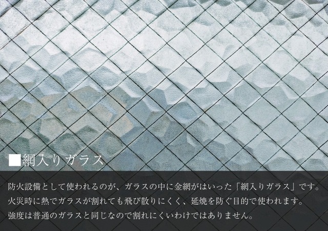 防火設備として使われるのが、ガラスの中に金網がはいった「網入りガラス」です。