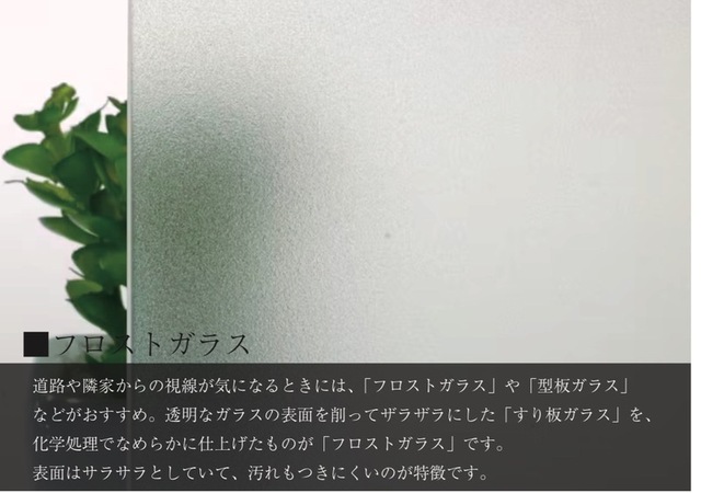 透明なガラスの表面を削ってザラザラにした「すり板ガラス」を、化学処理でなめらかに仕上げたものが「フロストガラス」です。