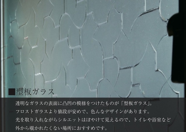 透明なガラスの表面に凸凹の模様をつけたものが「型板ガラス」。