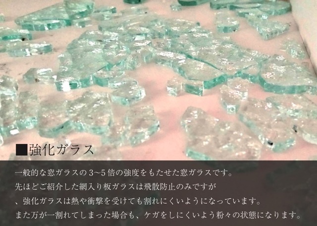 先ほどご紹介した網入り板ガラスは飛散防止のみですが、強化ガラスは熱や衝撃を受けても割れにくいようになっています。