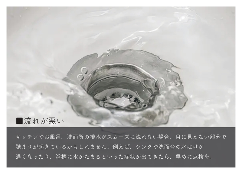 例えば、シンクや洗面台の水はけが遅くなったり、浴槽に水がたまるといった症状が出てきたら、早めに点検を。