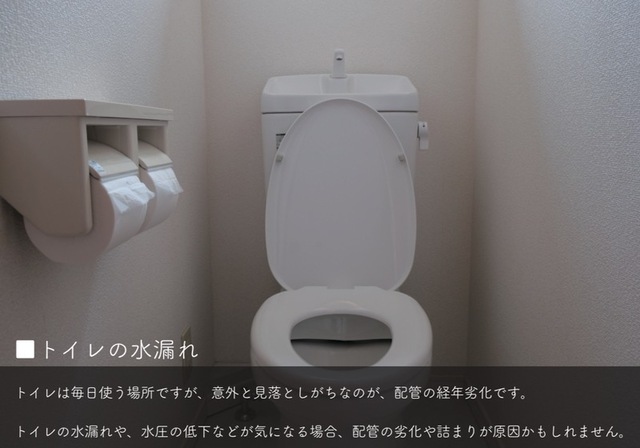 トイレの水漏れや、水圧の低下などが気になる場合、配管の劣化や詰まりが原因かもしれません。