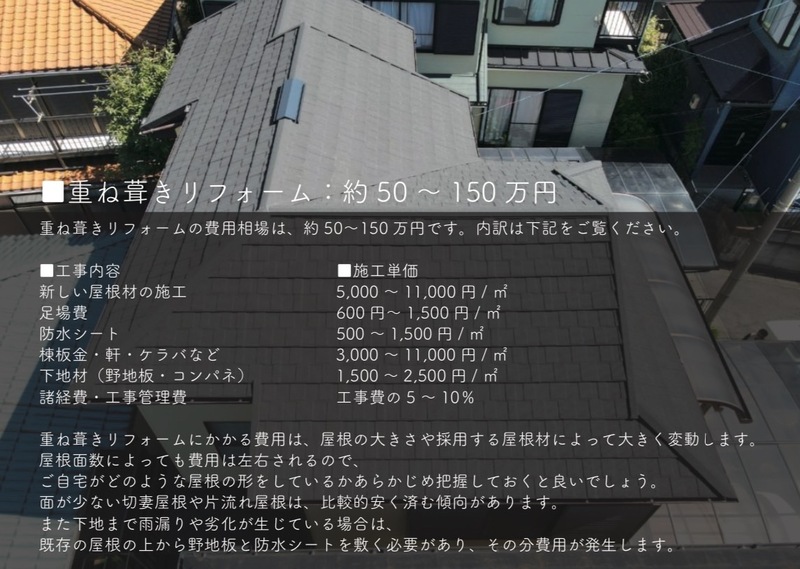 重ね葺きリフォームの費用相場は、約50〜150万円です。内訳は上記画像をご覧ください。