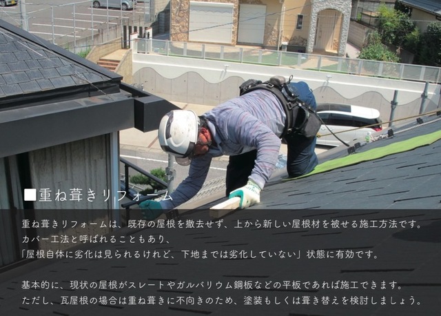 重ね葺きリフォームは、既存の屋根を撤去せず、上から新しい屋根材を被せる施工方法です。