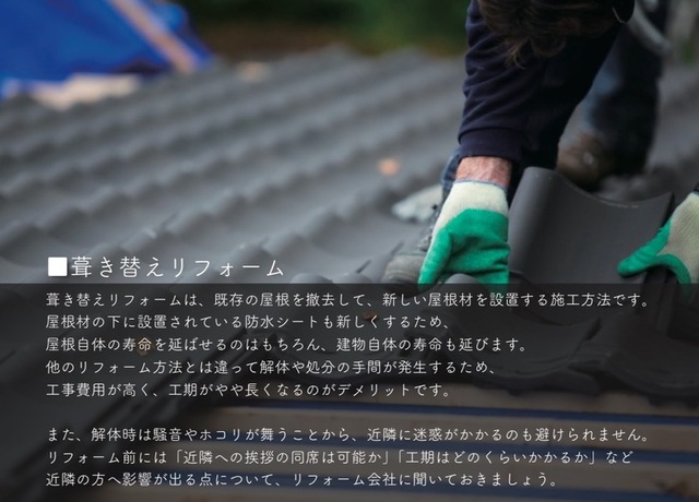 葺き替えリフォームは、既存の屋根を撤去して、新しい屋根材を設置する施工方法です。