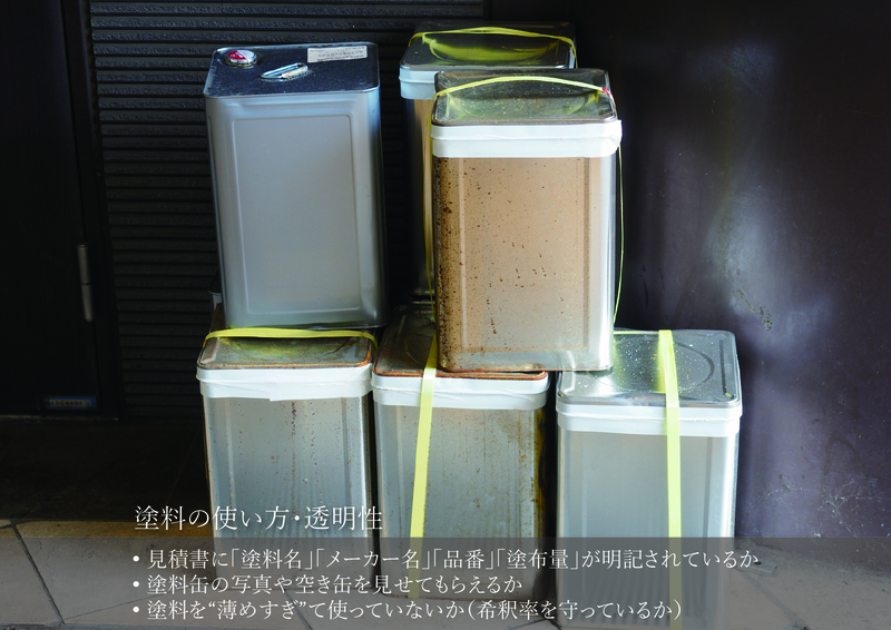 • 見積書に「塗料名」「メーカー名」「品番」「塗布量」が明記されているか