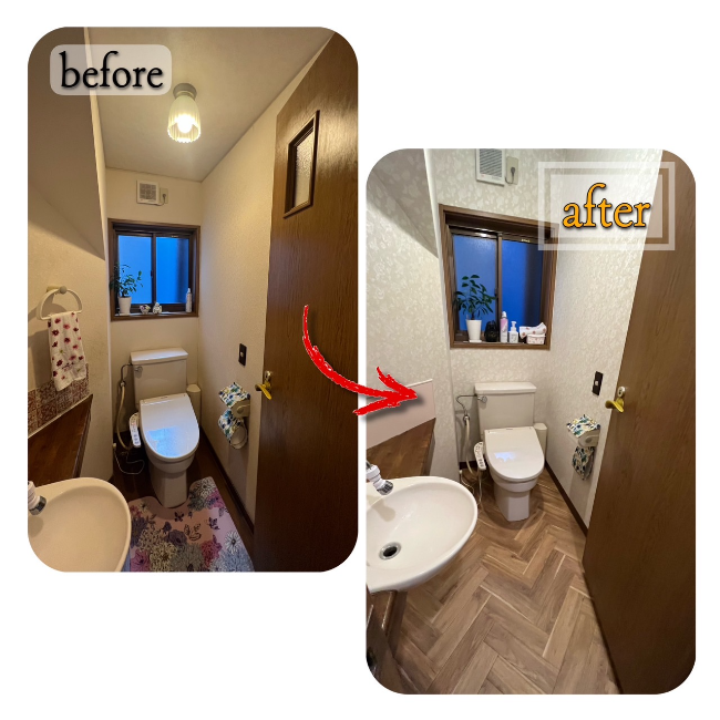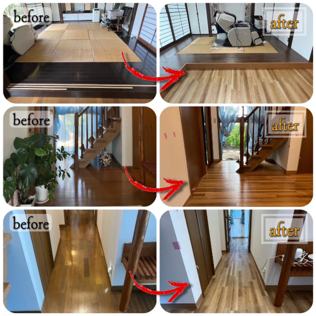 ・工期 1週間〜2週間・施工場所 宮崎市大島・使用した商品 ハウシア内装パック(トイレ)・お客様の声 お家の床が経年劣化で床鳴りがしていたところ、弊社のチラシをご覧になっていただきご依頼いただきました。施工中も職人さんや全員にお気遣いしていただきありがとうございました。お家への思い入れが強く、商品もいい物を選んでいただき非常にキレイな仕上がりになり喜んでいただきました。ありがとうございました。beforeafterbeforeafter 和室の一部を解体し、間取りを広げました。before&afterbefore&after トイレはハウシア内装パックで仕上げました。